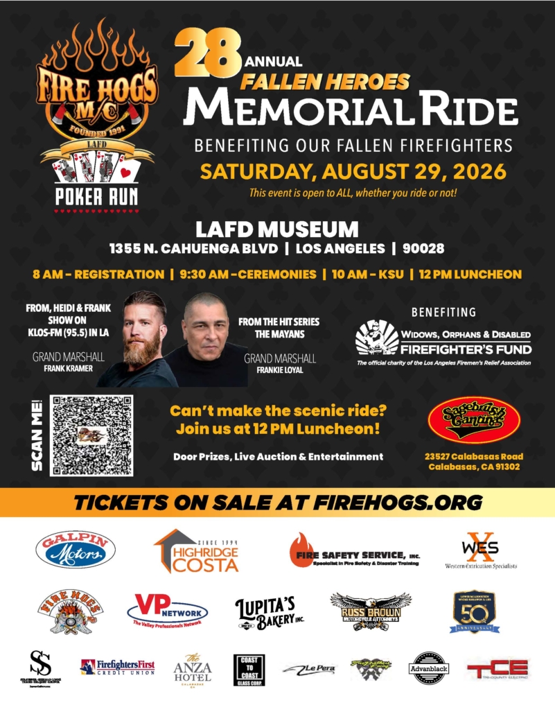 On Saturday, August 29, 2026, the LAFD Fire Hogs M/C will be sponsoring the 28th Annual Fallen Heroes Memorial Run to raise money for the Los Angeles Firemen’s Relief Association, Widows, Orphans, and Disabled Firemen’s Fund. Come join us once again as we start at THE LOS ANGELES FIRE DEPARTMENT MUSEUM (1355 N. Cahuenga Blvd, Hollywood,CA.), travel to the Sagebrush Cantina. Registration starts at 0800 hrs, ceremonies start at 0900 hrs with KSU at 1000 hrs. Travel with us as we go down Sunset Blvd as the four Fire Stations we pass provide a presentation, ride to PCH and along the coast and back inland to our final destination of the Sage Brush Cantina (23527 Calabasas rd., Calabasas) for music/ luncheon and fund raising to benefit the Widows, Orphans, and Disabled Firemen’s Fund. All are welcome! If ya can’t make the ride meet us at the Sagebrush for the luncheon, fundraising, and Music! Be there at 1200 to watch the riders come in!! The fundraising event at the Sagebrush Cantina start at 1230 pm. Join us for an afternoon of FUN!! Riders and NON-Riders are ALL WELCOME! Join us for an afternoon of FUN!! Riders and NON-Riders are ALL WELCOME!.